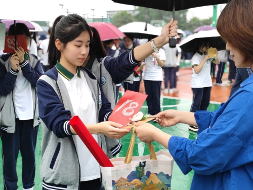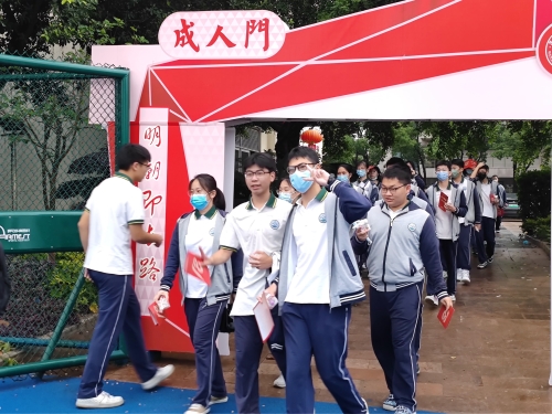 尽管当天下着小雨,但是同学们的热情丝毫不减,准时列队,走过神圣的成人门,宣告自己正式进入成人行列。