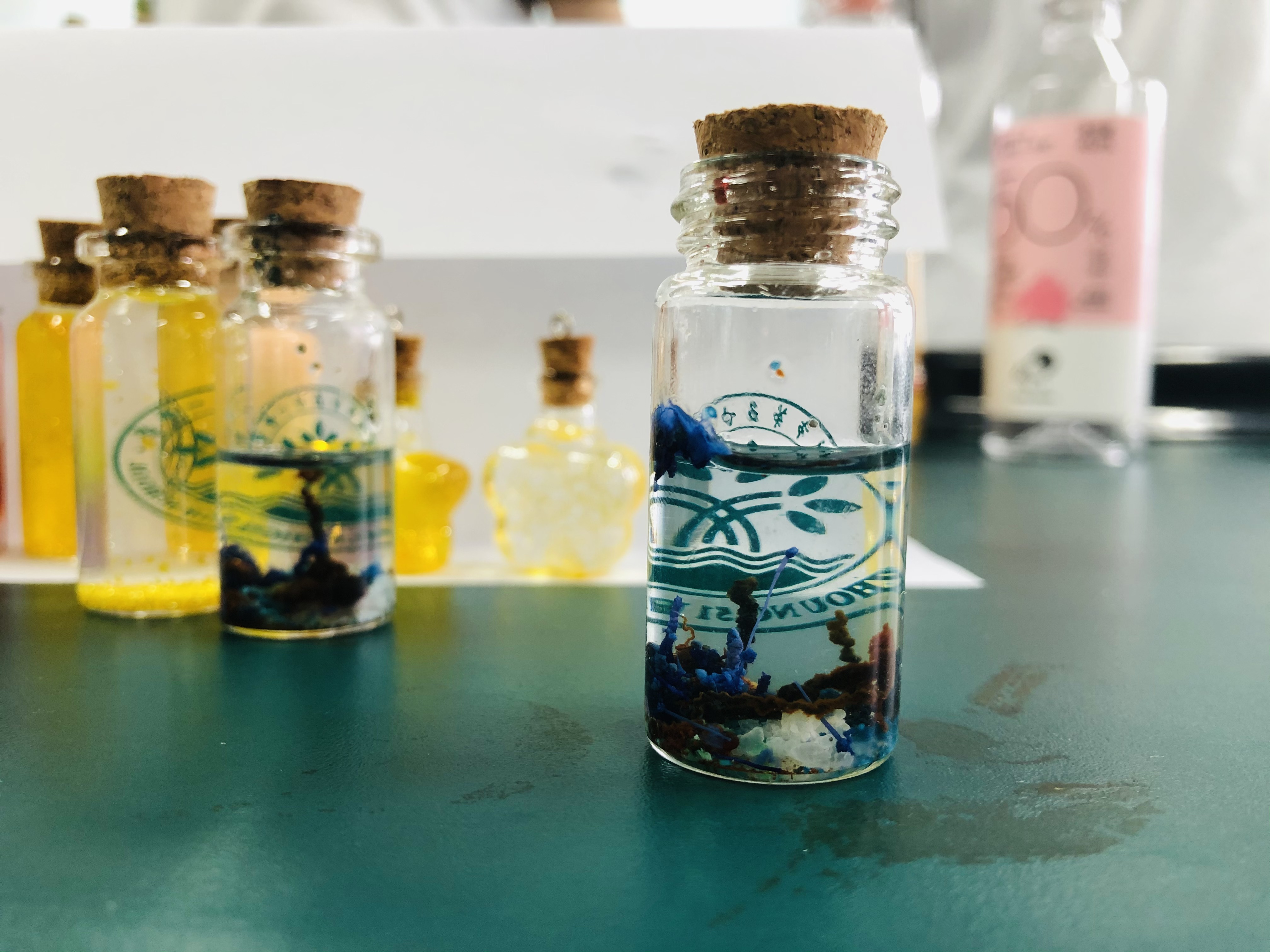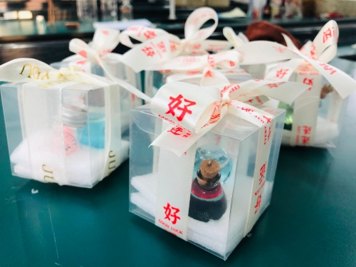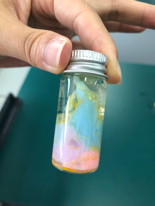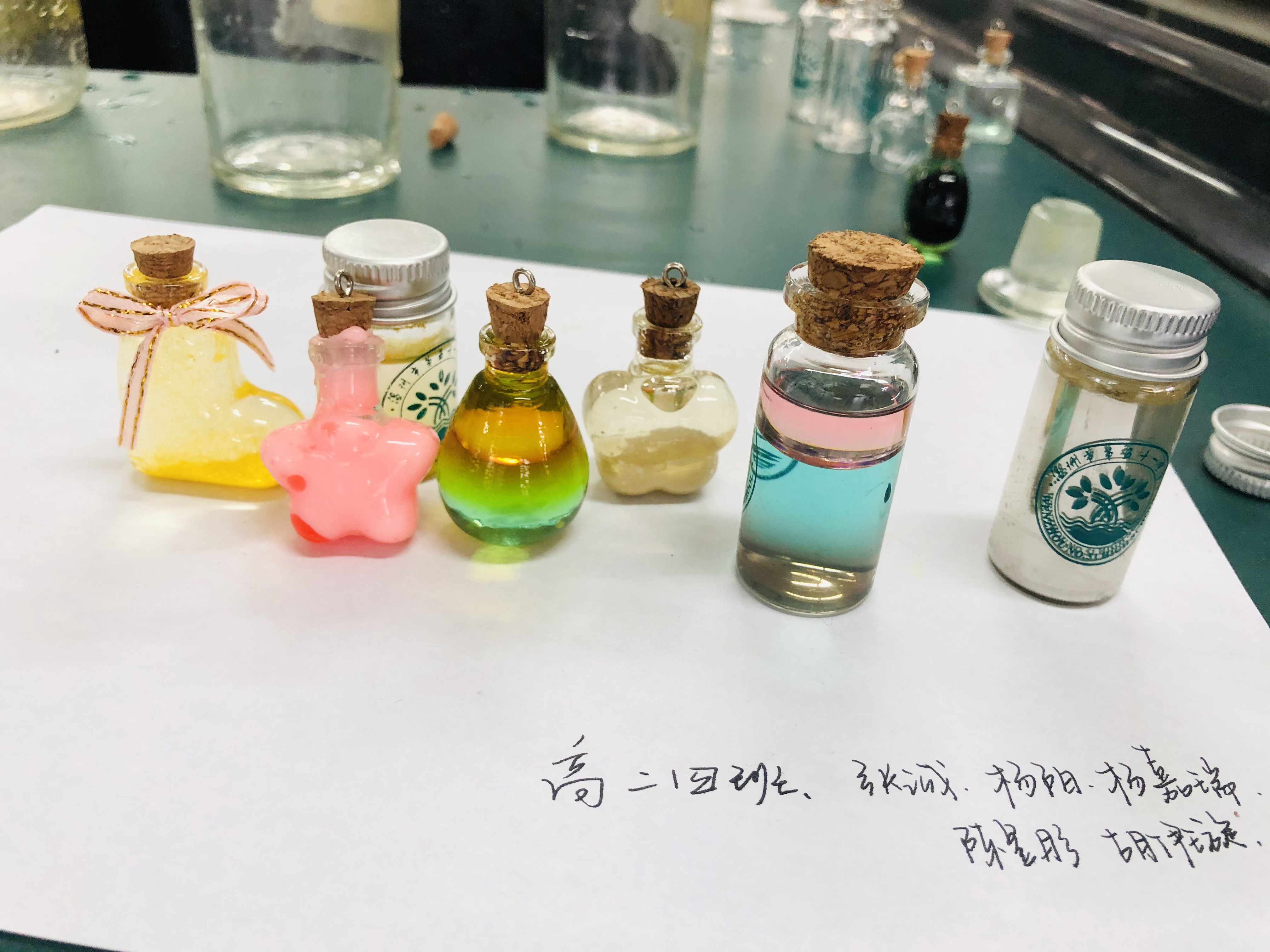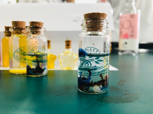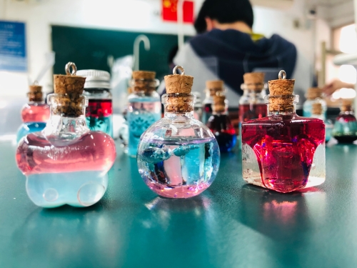 高二段的“疯狂许愿瓶”创意设计活动也是精彩纷呈。同学们通过查阅资料、实验探究、创新设计,设计了“黄金雨瓶”“花园瓶”“彩虹瓶”“蓝晶瓶”“银镜瓶”“彩蜡瓶”“多彩人生瓶”等多种多样的许愿瓶,并将它们装盒包装,作为礼物送给高三化学班同学,以这样特别的礼物为高三学长加油助威。同学们将自己所学的化学知识转化为缤纷多彩的化学实验作品,在这个过程中提升了化学学科素养、团队合作能力,能力十足、创意拉满。