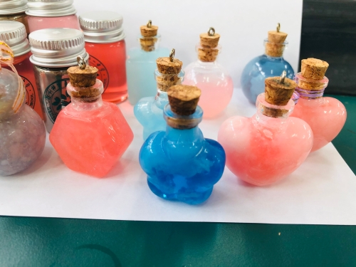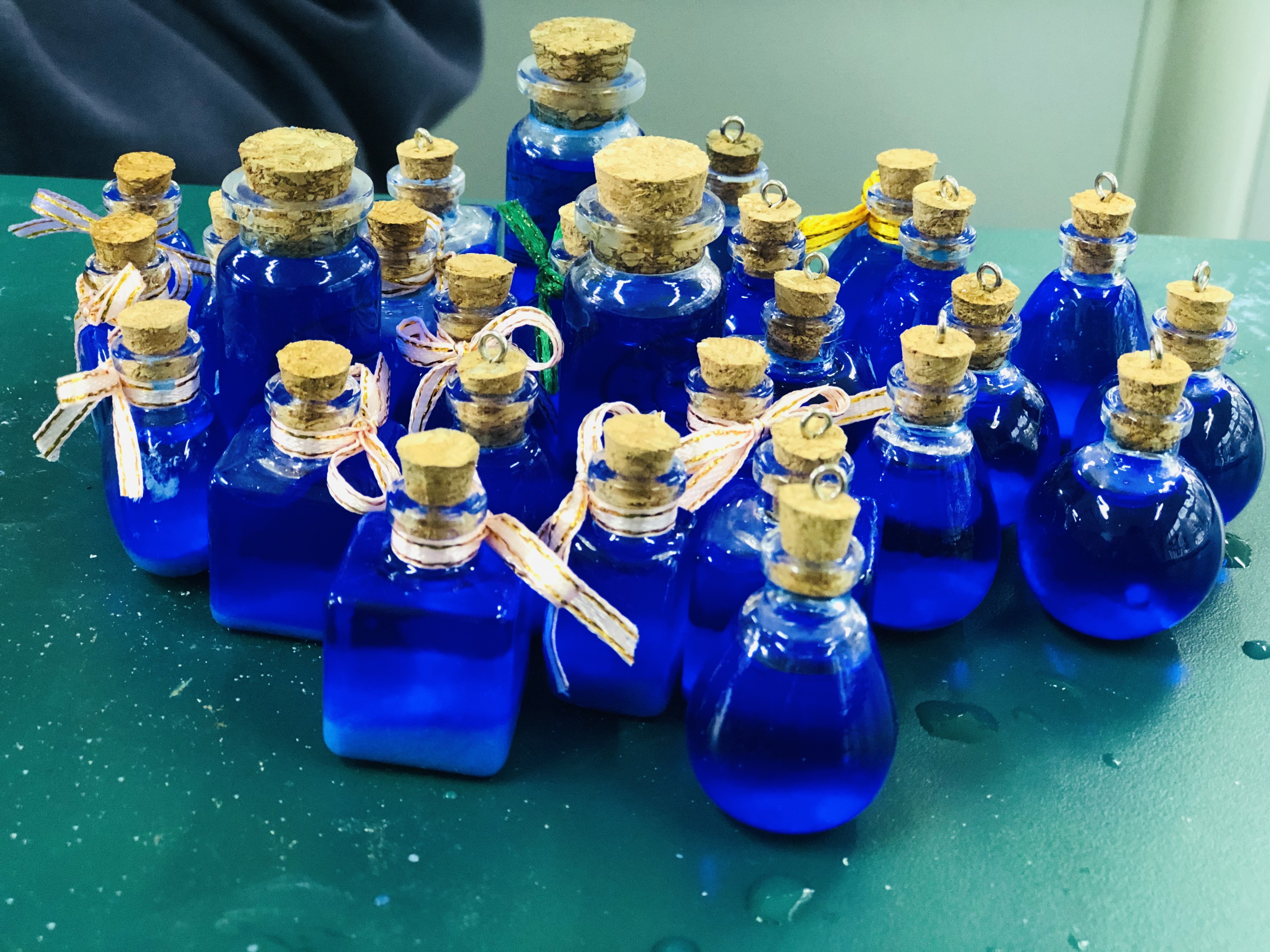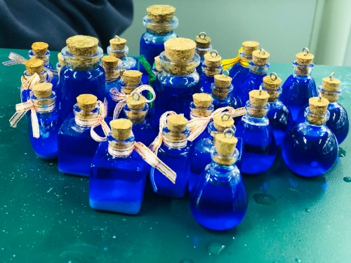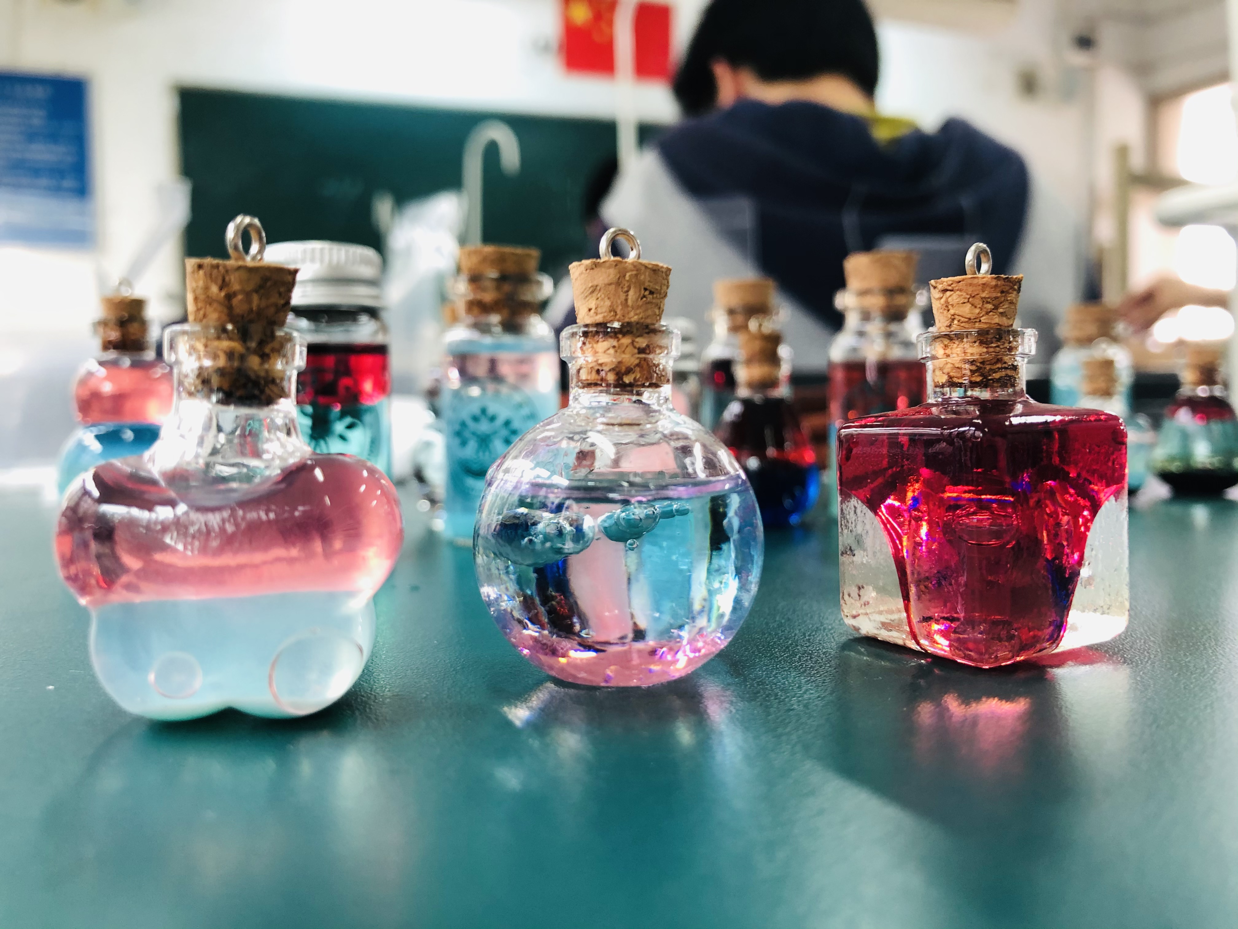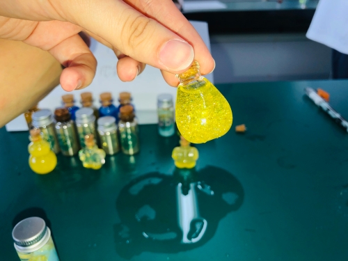 高二段的“疯狂许愿瓶”创意设计活动也是精彩纷呈。同学们通过查阅资料、实验探究、创新设计,设计了“黄金雨瓶”“花园瓶”“彩虹瓶”“蓝晶瓶”“银镜瓶”“彩蜡瓶”“多彩人生瓶”等多种多样的许愿瓶,并将它们装盒包装,作为礼物送给高三化学班同学,以这样特别的礼物为高三学长加油助威。同学们将自己所学的化学知识转化为缤纷多彩的化学实验作品,在这个过程中提升了化学学科素养、团队合作能力,能力十足、创意拉满。