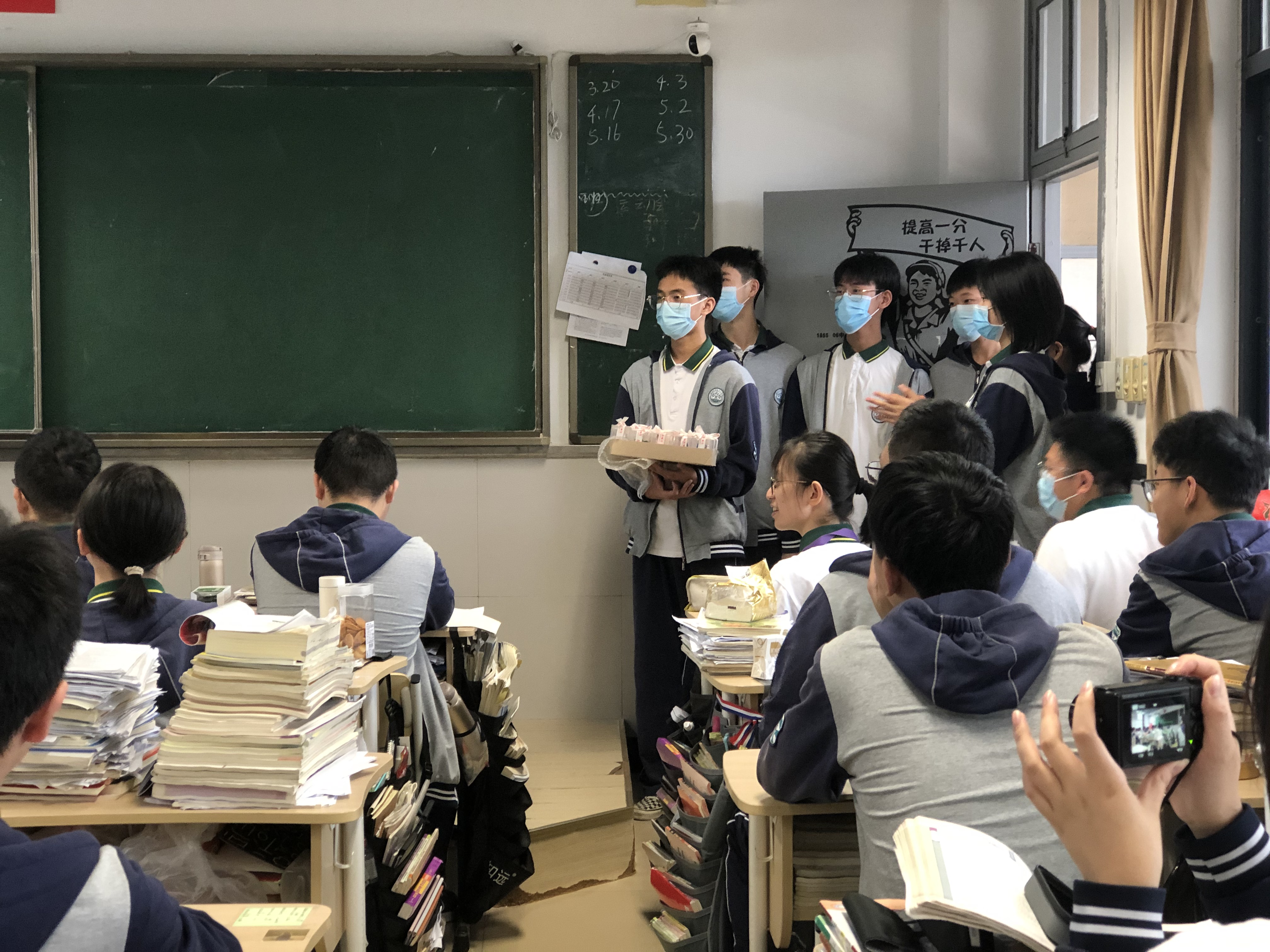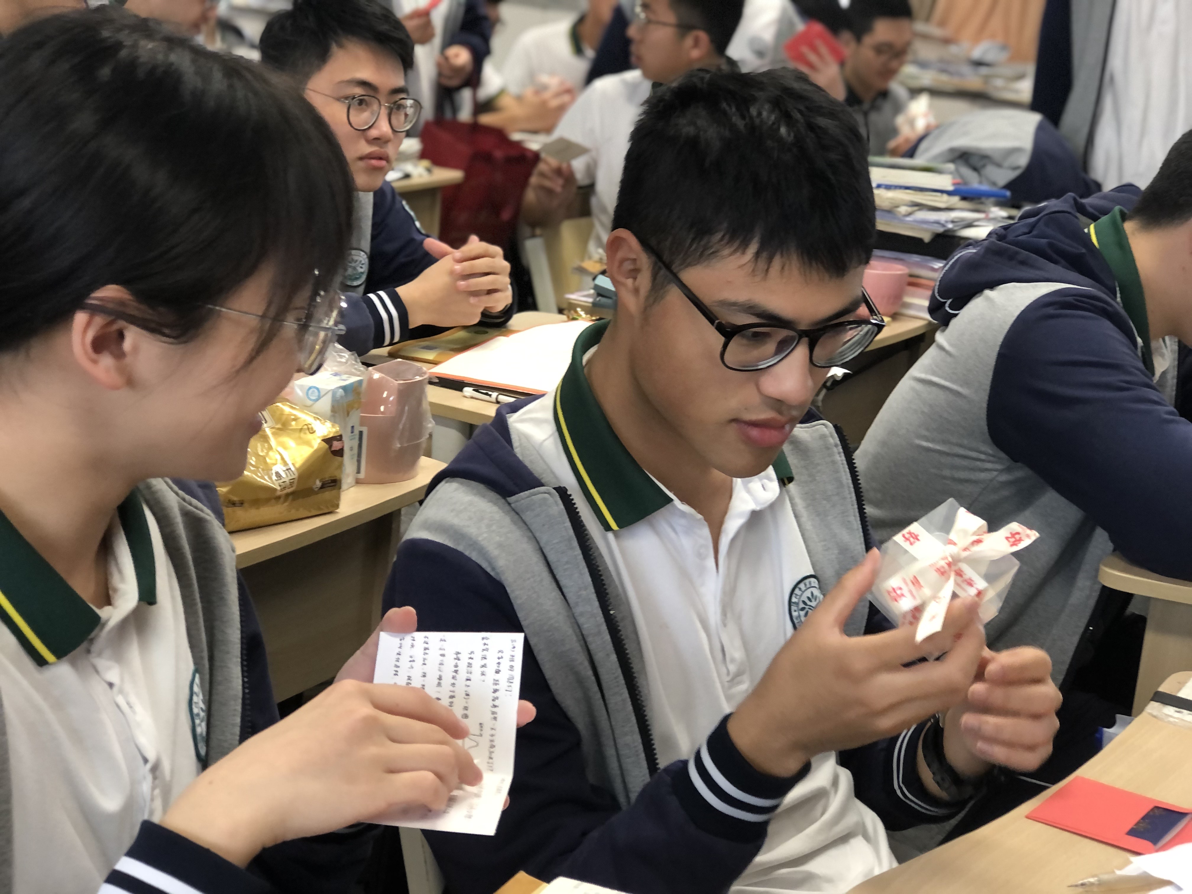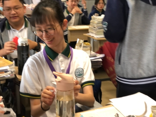 5月11日,在高三成人礼活动现场,高二化学班7位同学作为代表,给高三化学班学长送去了亲手制作的许愿瓶和贺卡,祝福他们高考加油!