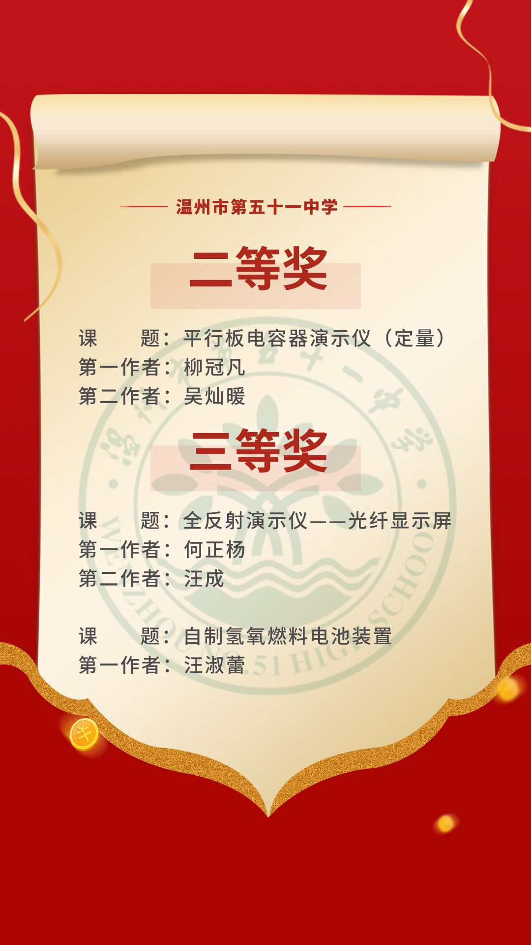 在2022年度温州市中小学优秀自制教具评选获奖名单中,我校优秀自制教具《平行板电容器演示仪(定量)》荣获二等奖!《全反射演示仪——光纤显示屏》、《自制氢氧燃料电池装置》荣获三等奖!为他们点赞!