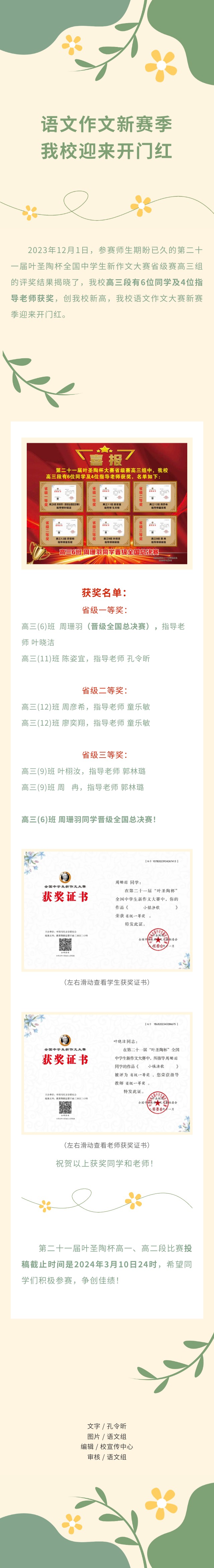 语文作文新赛季,我校迎来开门红!——第二十一届叶圣陶杯作文大赛省赛高三组评奖揭晓