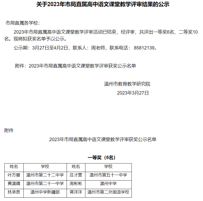 同时,在温州市教育教学研究院组织的2023年市局直属高中语文课堂教学评比中,我校庄才营老师荣获一等奖!