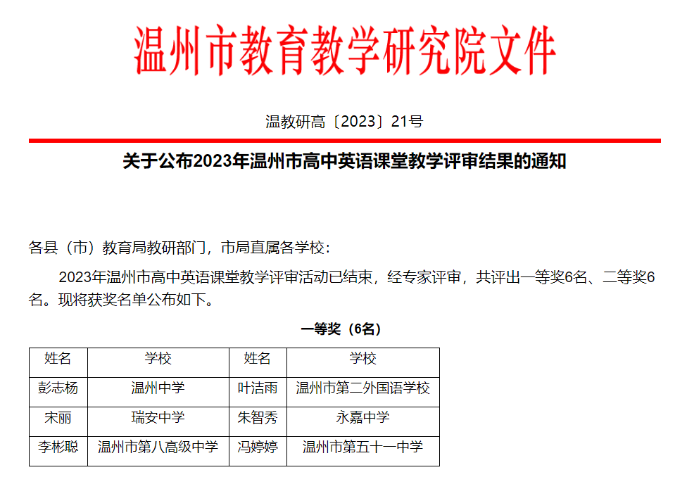 在温州市教育教学研究院组织的2023年温州市高中英语课堂教学评比中,我校冯婷婷老师荣获一等奖!