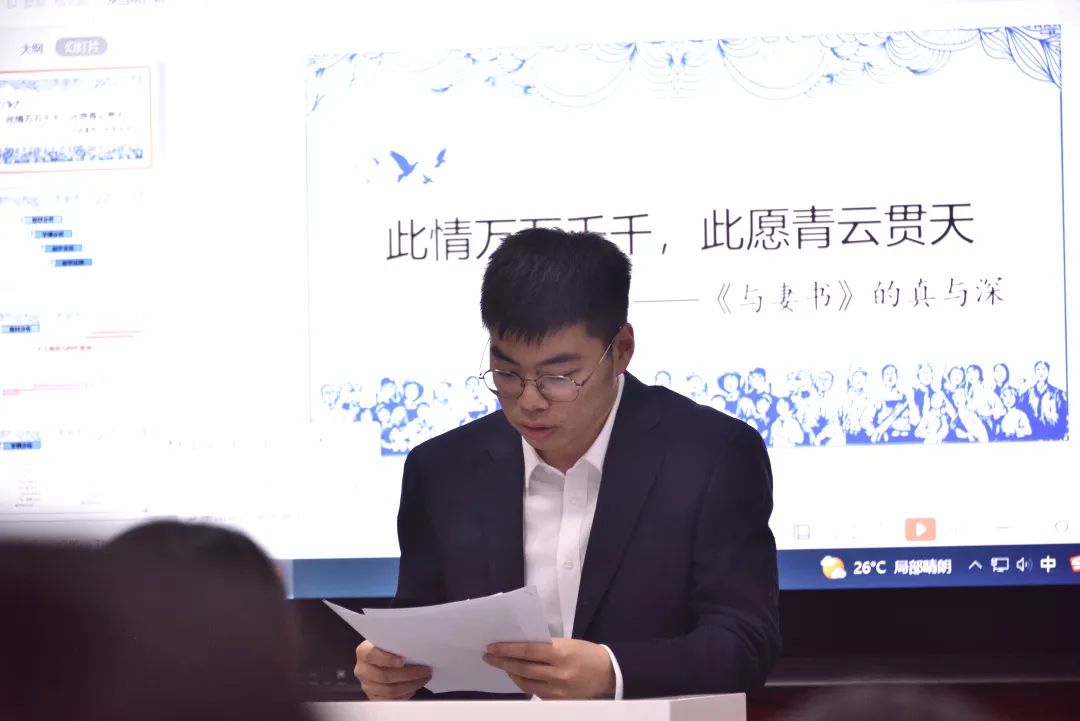 本环节由我校青年教师庄才营老师在温州中学新疆部微格教室带来展示课《此情万万千千,此愿青云贯天——〈与妻书〉的真与深》。