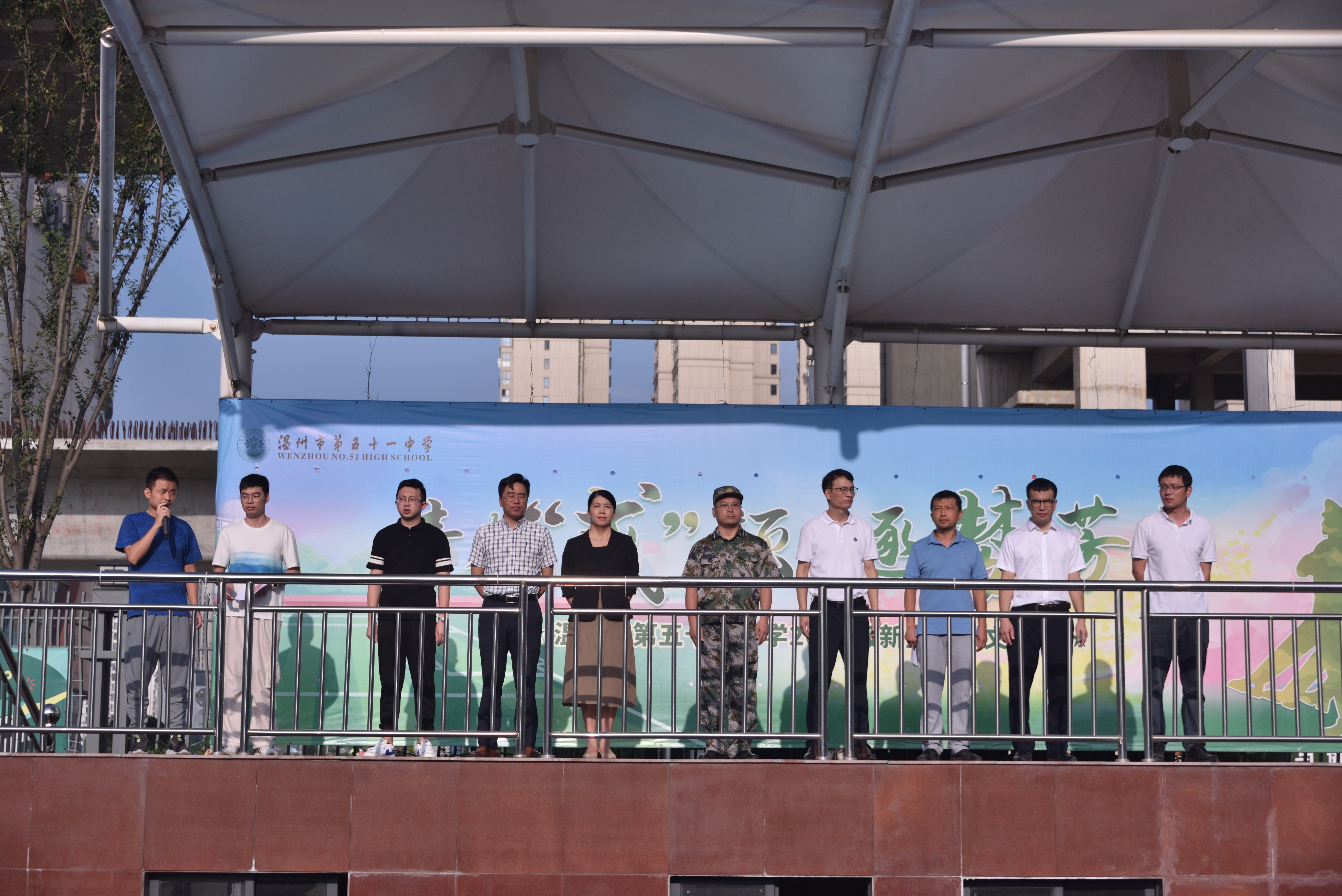 温州市第五十一中学党总支书记、校长陈平,鹿城区人武部后勤中心主任施小林,温州市第五十一中学副校长吴国栋、包虹、赵清宝,高一段长徐益勇,政教主任童鹿超,政教副主任陈建乐以及所有高一段班主任出席开营仪式,团委书记庄才营主持开营仪式,体育组组长彭永敏主持升旗仪式。
